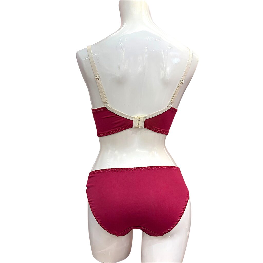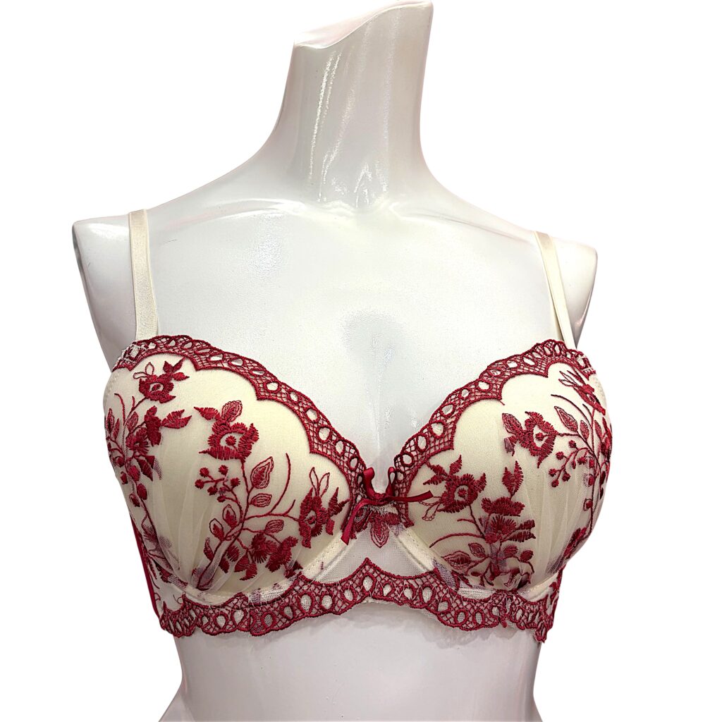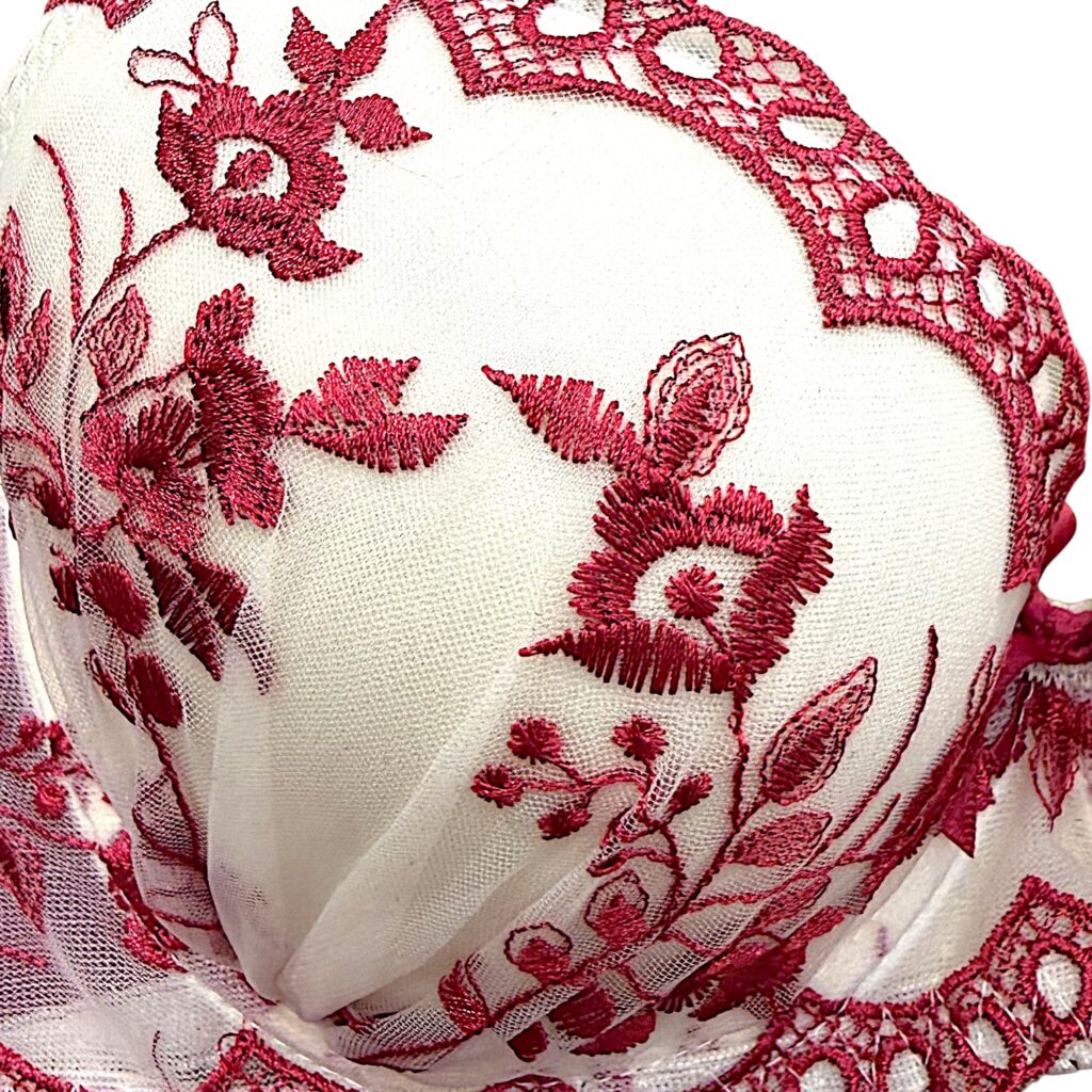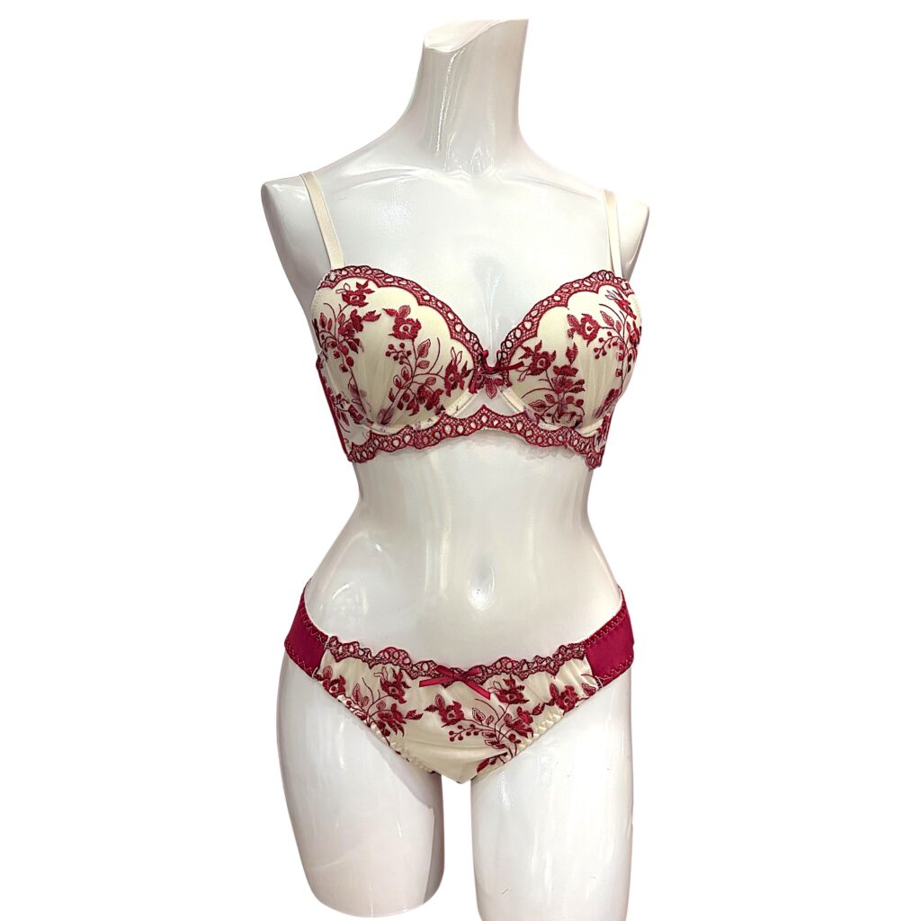 上品なアイボリー生地に深みのあるボルドーレッドの花柄刺繍を施したブラ&ショーツのセット。 透け感のあるレースと立体的な刺繍が高級感を演出し、特別な日にもデイリーにも使えるデザイン。 柔らかな素材で肌あたりが優しく、見た目だけでなく着け心地にもこだわりました。