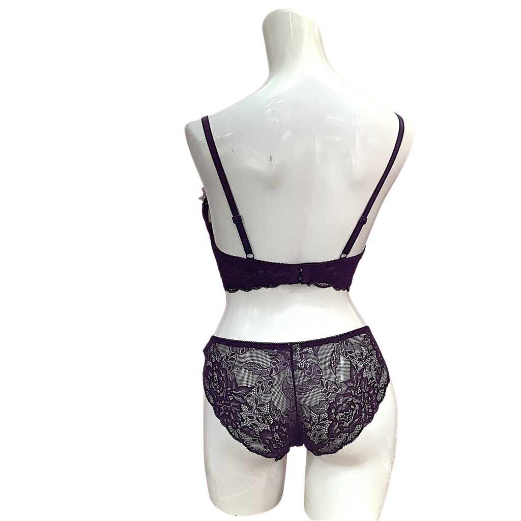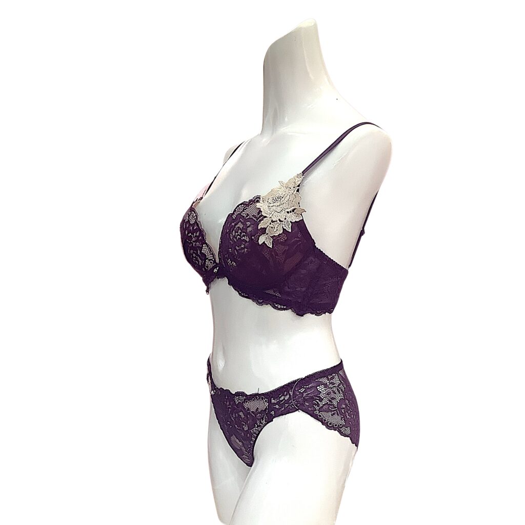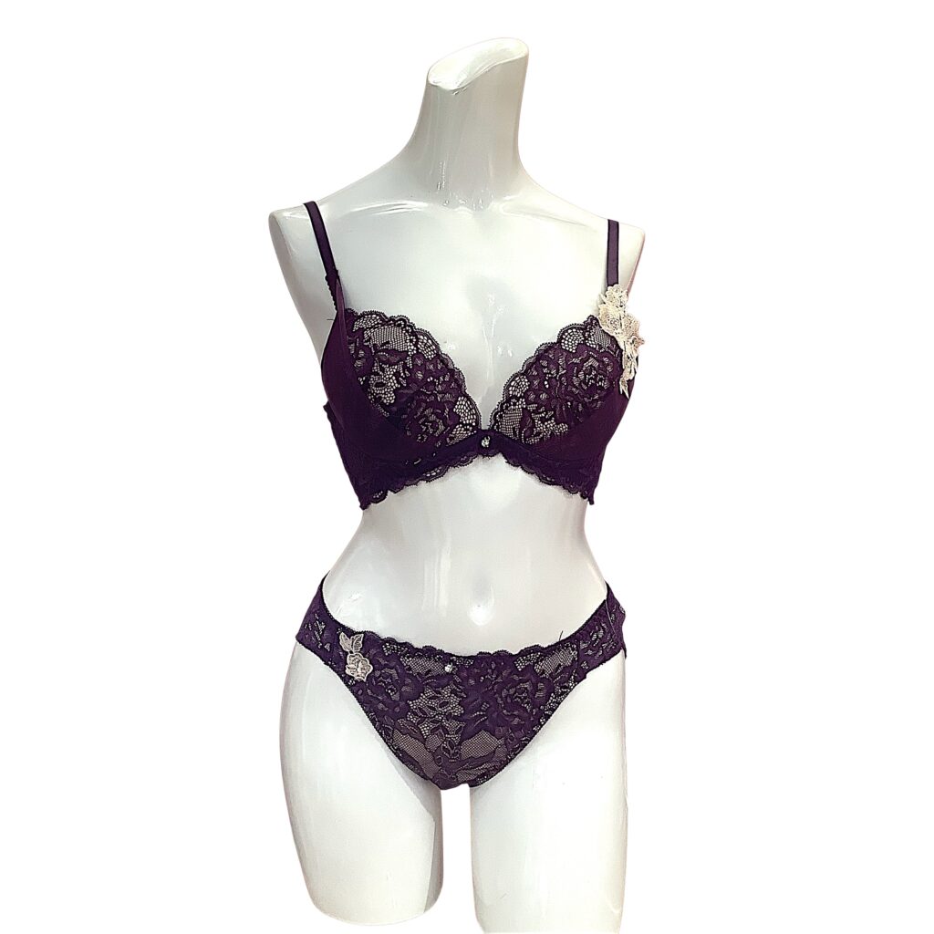 淡いピンクのベースに繊細な刺繍レースを重ねた上品なデザイン。軽やかな着心地で、普段使いから特別な日まで幅広く活躍するランジェリーセットです。