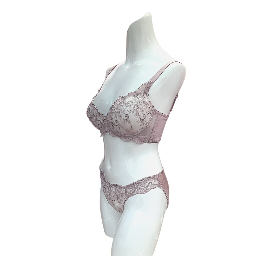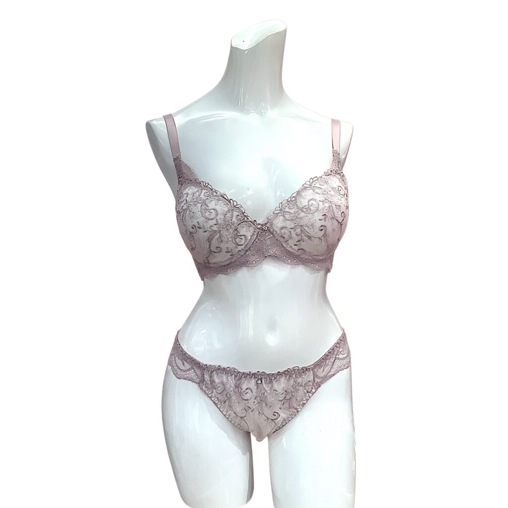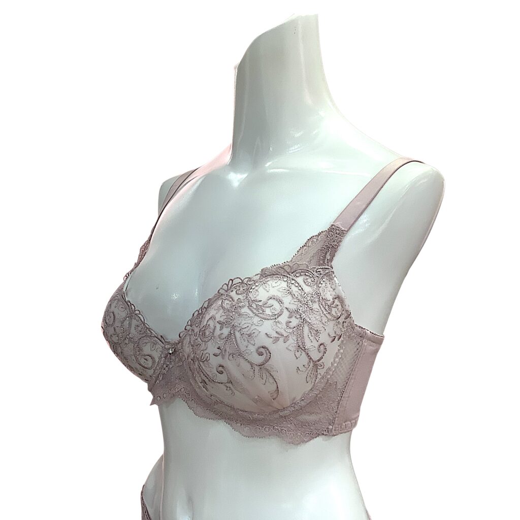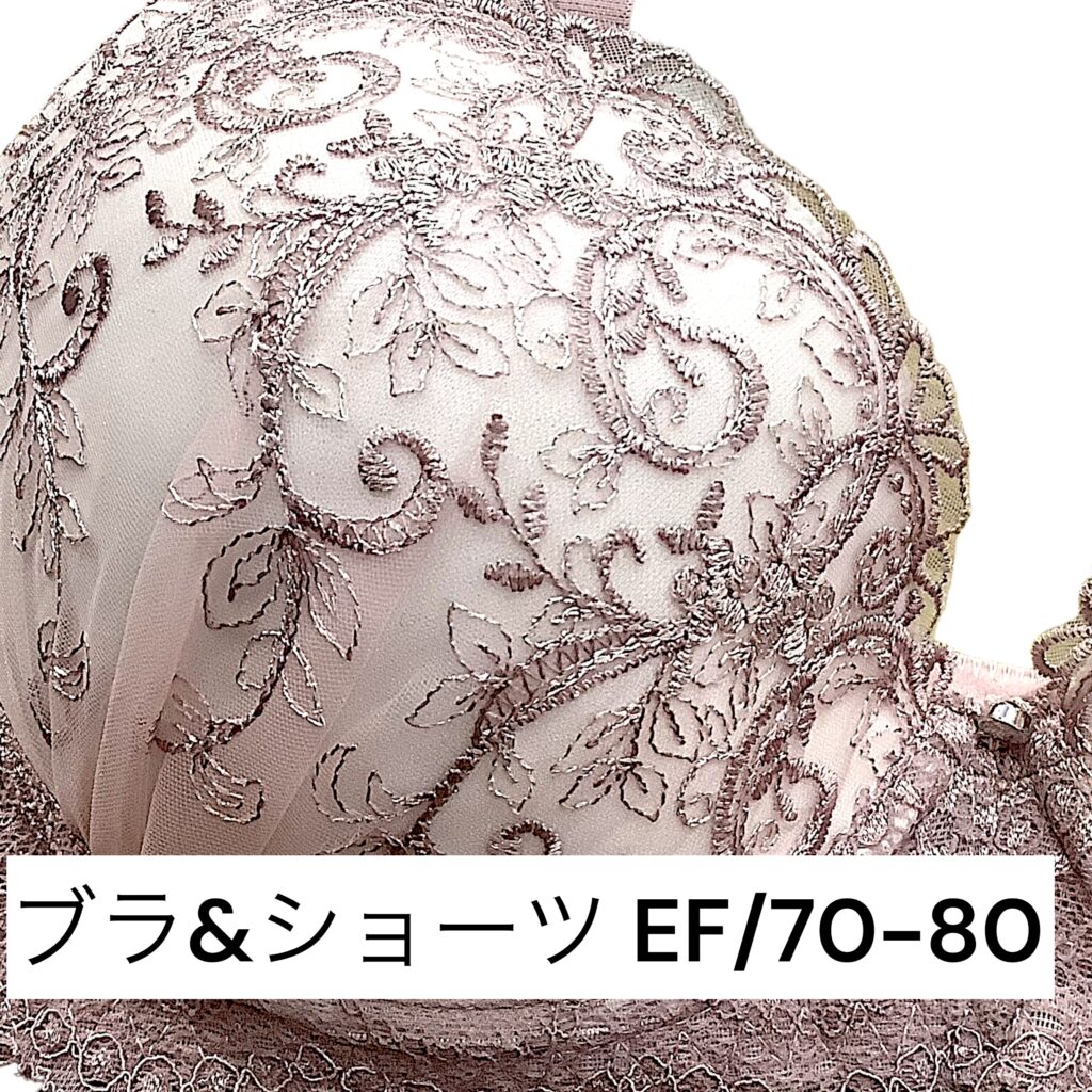 ピンクベージュのレースに繊細な刺繍を施した上品なランジェリー。EFカップ対応の立体設計でボリューム感のある美しいバストラインを演出し、華やかさと安定感を両立します。