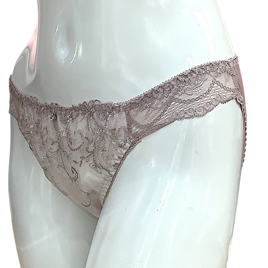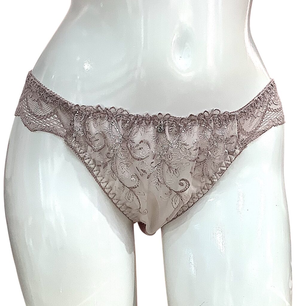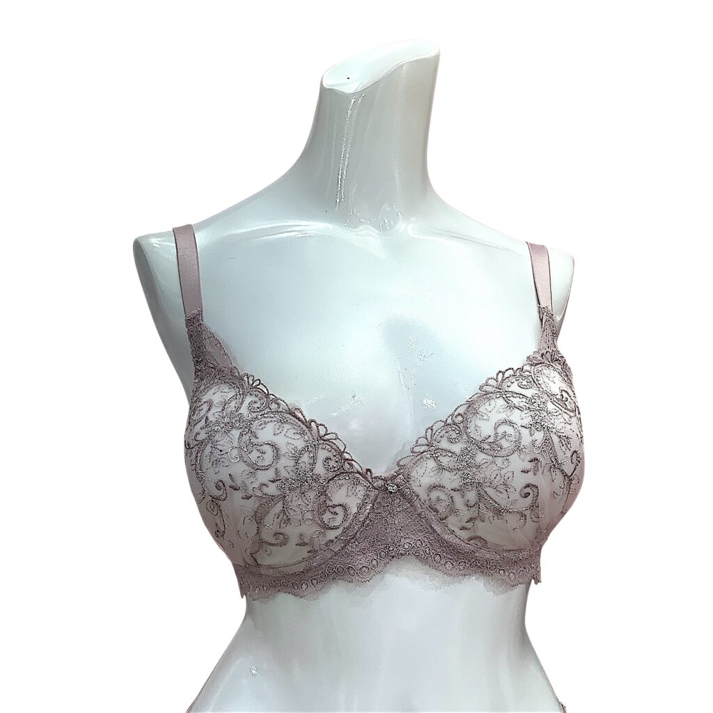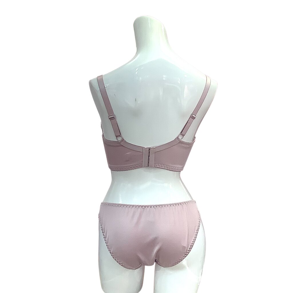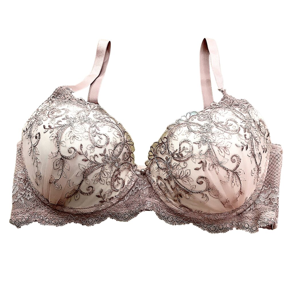 ピンクベージュのレースに繊細な刺繍を施した上品なランジェリー。EFカップ対応の立体設計でボリューム感のある美しいバストラインを演出し、華やかさと安定感を両立します。