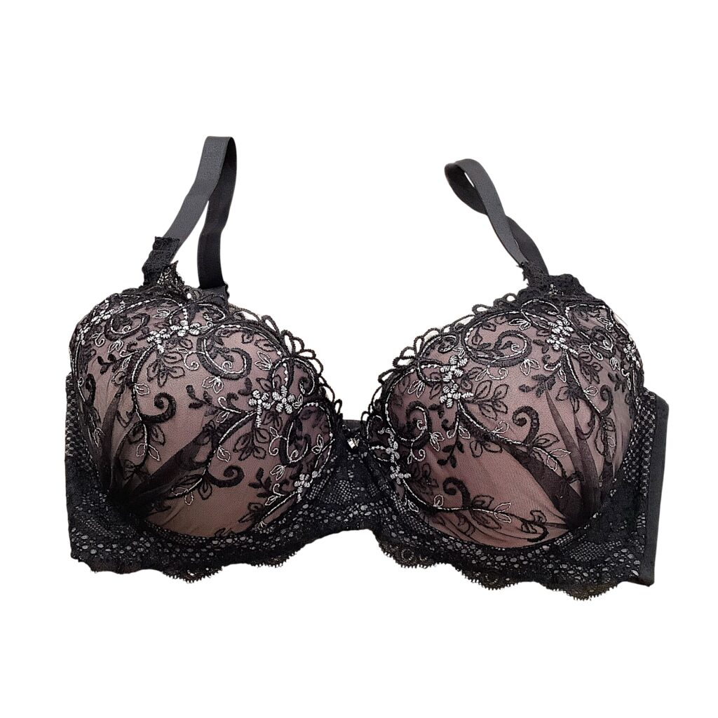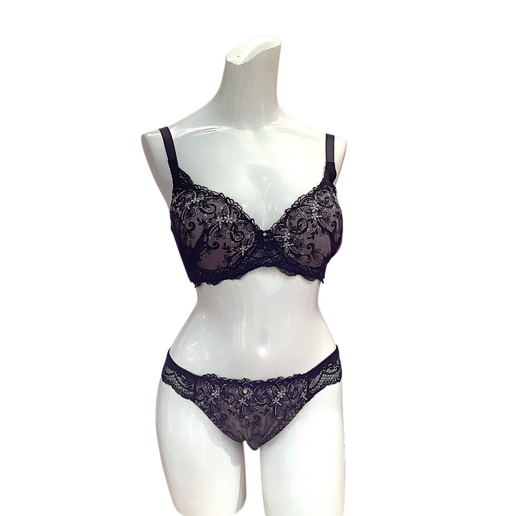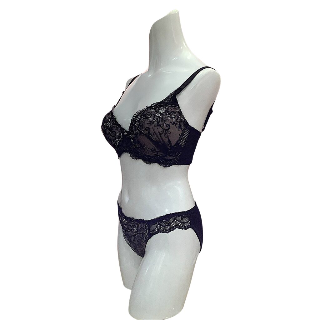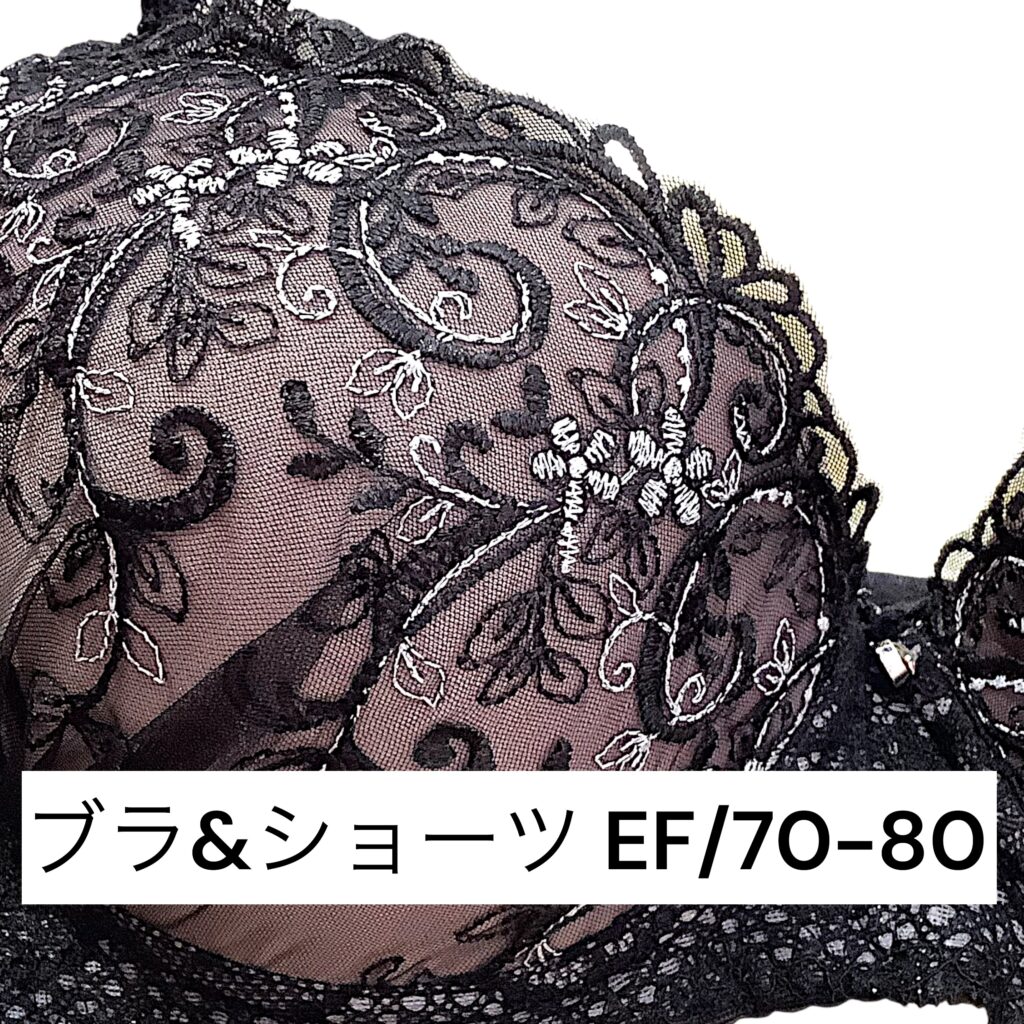 黒レースに繊細な刺繍をあしらった高級感あふれるランジェリー。EFカップ対応の立体カップ設計で美しいボリュームラインを演出し、華やかさと安定感を両立します。