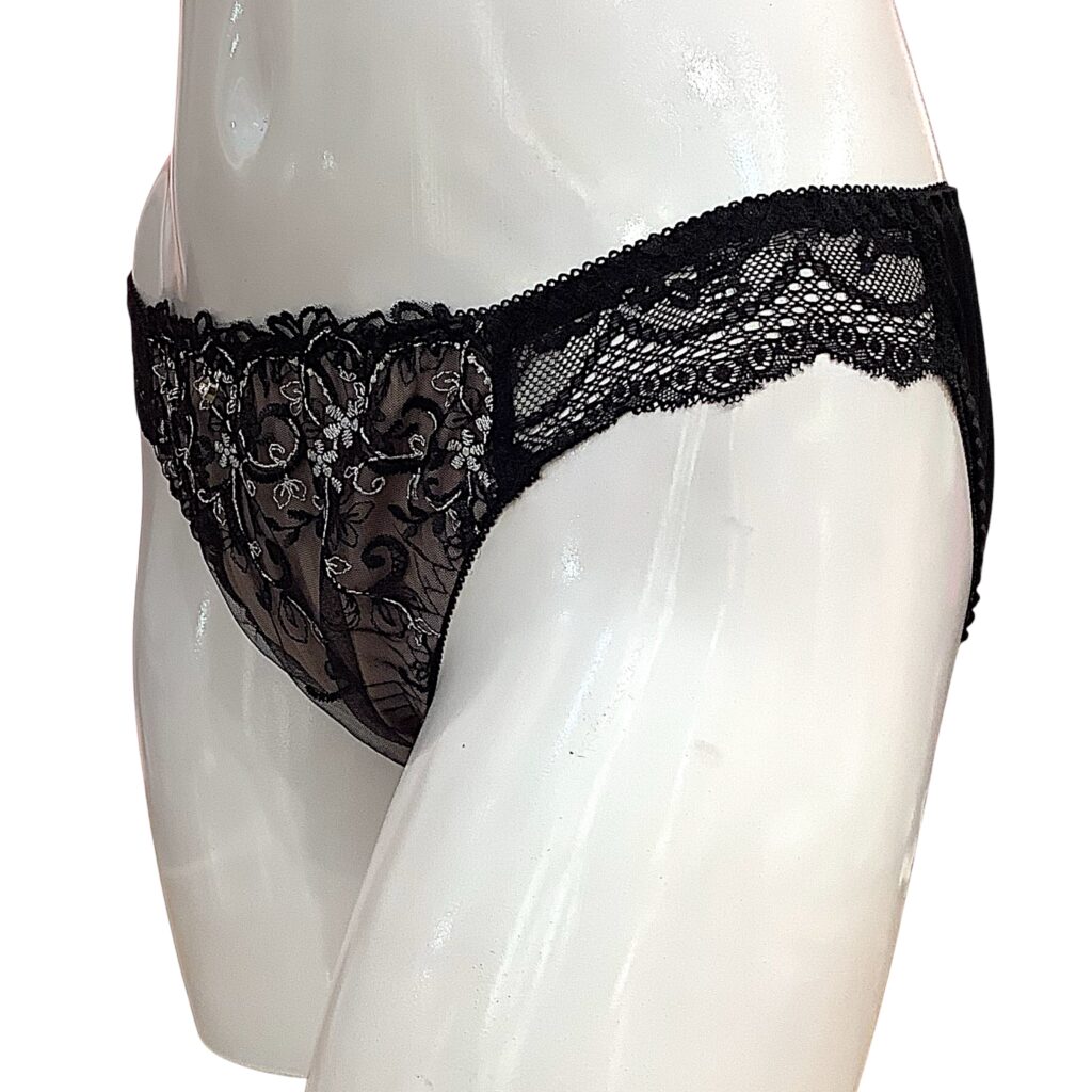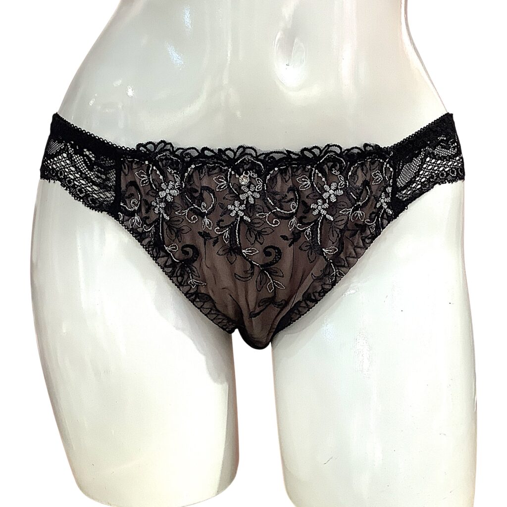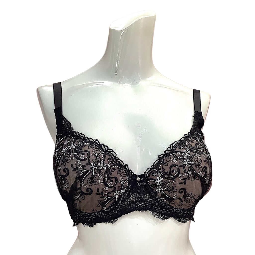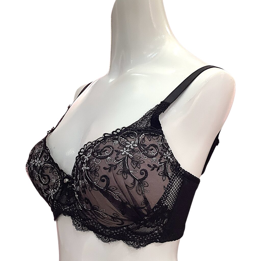 黒レースに繊細な刺繍をあしらった高級感あふれるランジェリー。EFカップ対応の立体カップ設計で美しいボリュームラインを演出し、華やかさと安定感を両立します。
