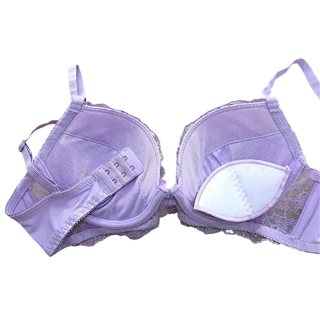 やわらかなラベンダーに白を重ねた、甘さと透明感のあるブラ&ショーツセットです。胸もとの花柄レースは細いアウトラインがきらっと光り、シンプルな服の下でも女性らしさをふわっと引き上げてくれます。BCDカップ対応の立体カップで、ボリュームを出しすぎずにきれいな丸みをメイク。デコルテをすっきり見せたい方や、ナチュラル派の方にもおすすめです。ショーツは前がレース、後ろは無地でひびきにくく、デイリーに使いやすい仕様。気分を上げたい日にも、普段のおしゃれにもマッチする万能ラベンダーです。